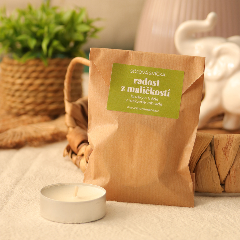 Všechny vůně pochází z ručně litých sójových svíček Momentee. Každou z nich můžete běžně pořídit i ve velké svíčce - tady jsou v mini verzi, připravené k otestování nebo k darování.